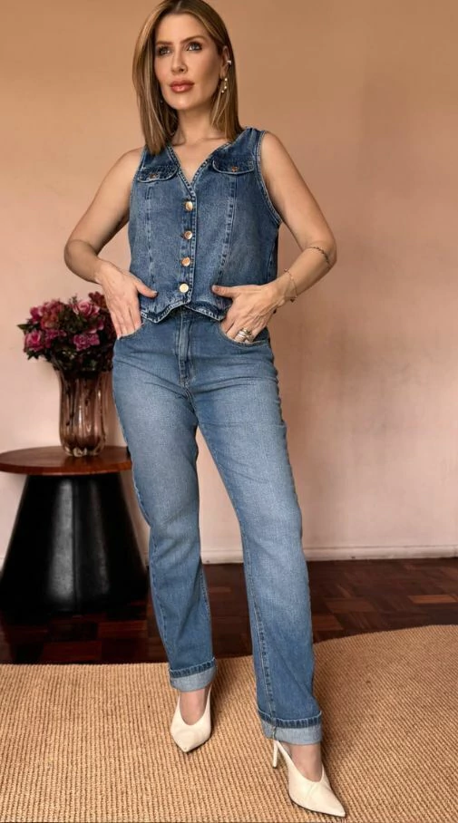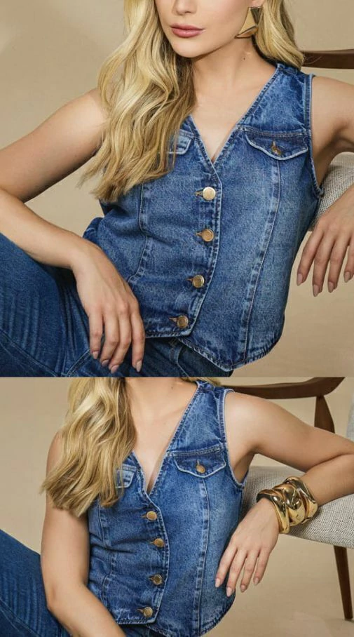 Colete Jeans Kacolako: Estilo que abraça você Disponível nos tamanhos P (38), M (40) e G (42), o Colete Jeans Kacolako oferece o ajuste perfeito para valorizar sua silhueta com conforto. Sua modelagem moderna e o tecido jeans de alta qualidade garantem versatilidade para looks casuais ou despojados. Transforme seu visual com uma peça que combina tradição e personalidade — escolha o Colete Jeans Kacolako e sinta-se única em qualquer ocasião!