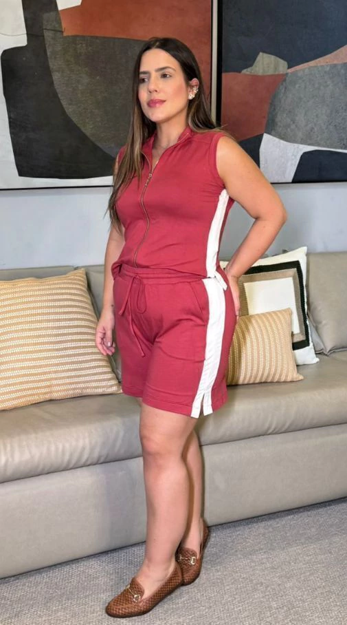 Para um estilo casual, combine o conjunto com tênis branco e acessórios minimalistas, criando um look despojado e confortável. Se a ocasião pede algo mais sofisticado, aposte em sandálias de salto e acessórios delicados que realcem a produção.
