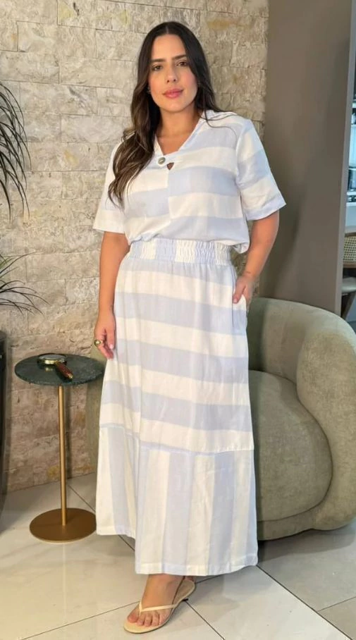 Apresentamos o Conjunto Lista confeccionado com atenção especial para valorizar seu corpo nas medidas M 42, G 44 e GG 46. Com design moderno e listras que são a cara da estação, ele é perfeito para quem busca estilo sem abrir mão do conforto.